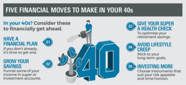 Your 40s could be your peak earning years, so it may be a good idea to ramp up your savings and funnel some of your income into your superannuation or investment accounts. But be sure to do your homework and consult with a professional financial adviser about your options.